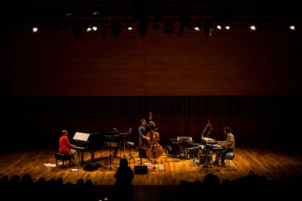 Abrieron el concierto con De tu lado del mar, dedicado al pianista portugués Mario Laginha. Una melodía extática que recorre toda una gama de colores melancólicos; un ritmo apenas esbozado por la base rítmica le permite al pianista explayarse a través de un lenguaje cargado de imágenes en las que asoma esencialmente la nostalgia. Por momentos, el contrabajo se convierte en interlocutor subrayando con su tempo las vivencias de Aguirre. En Palabras para nombrarte mantiene la atmósfera de la composición anterior, aunque a la línea melódica refleja una claridad evocativa y un vocabulario rico en sutilezas. Un andar relajado que parece que se expande armoniosamente sobre un recinto hipnotizado por la belleza. Nuevamente, Silva es quien dialoga con el pianista, una conversación de la que surge un arco de suave tensión sobre la melodía.